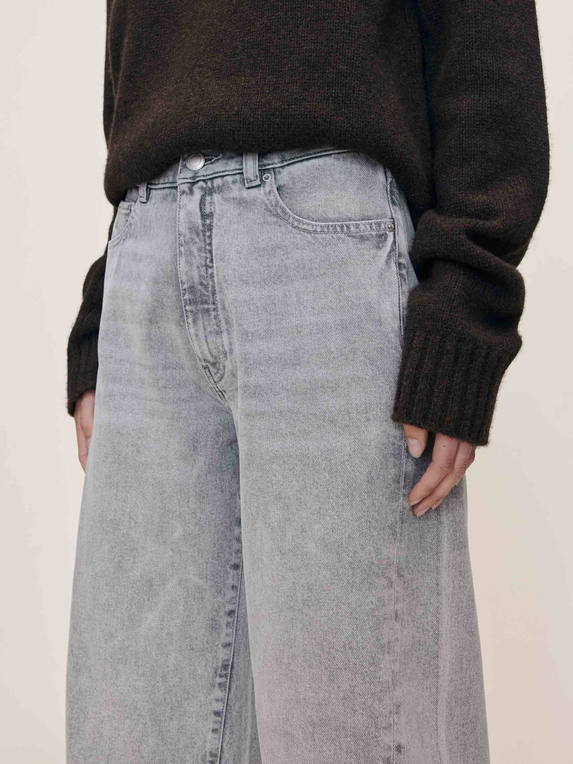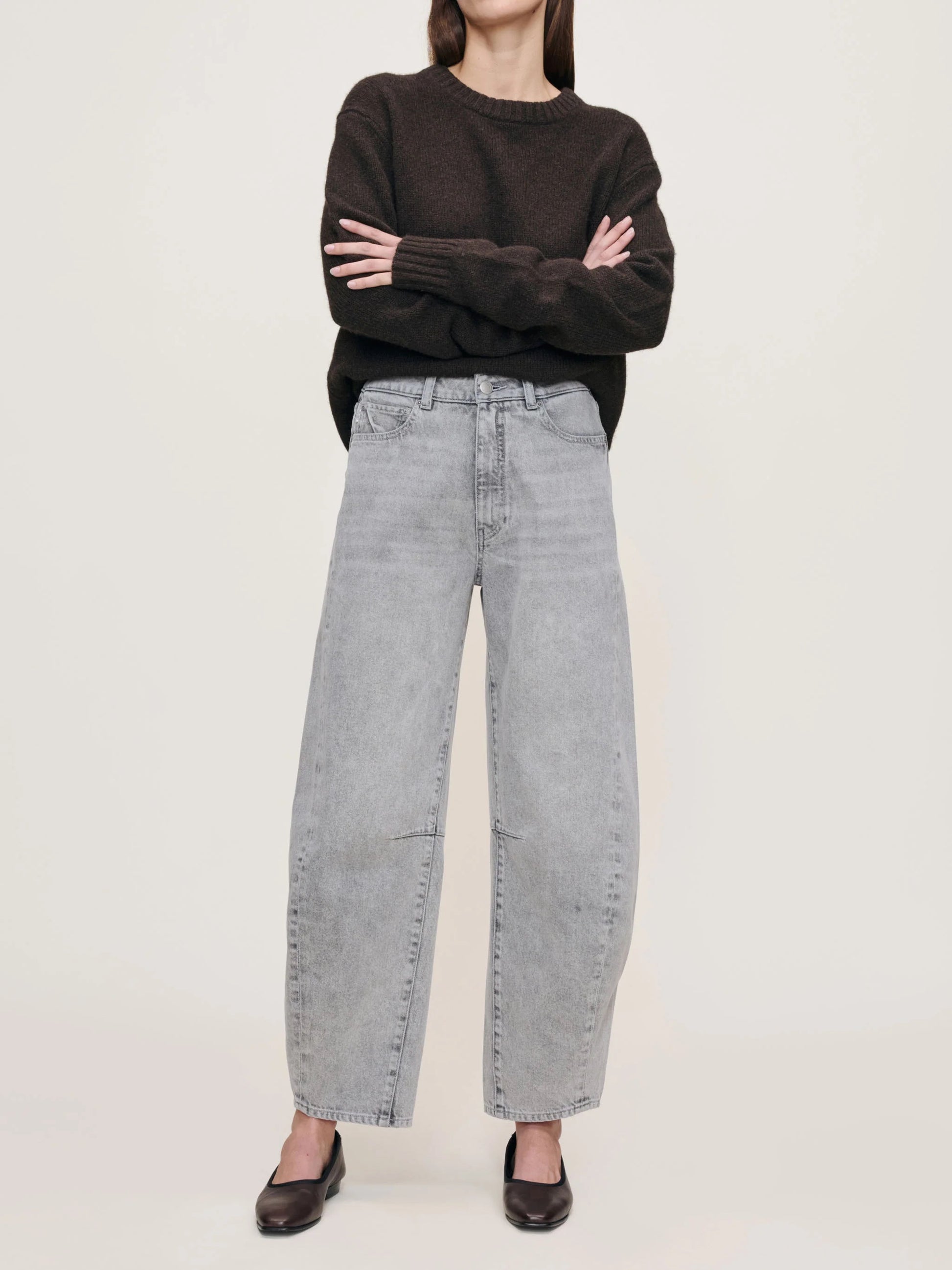 The DL1961 Miro Barrel is a high-rise jean with a true barrel leg silhouette, fitted snugly at the hip and tapering through the leg for a refined, modern look. Storm Cloud is a washed light grey denim with authentic vintage character, featuring silver hardware, tonal stitching, a clean hem, and an ecru back patch. This versatile style combines effortless sophistication with quality craftsmanship for everyday wear.