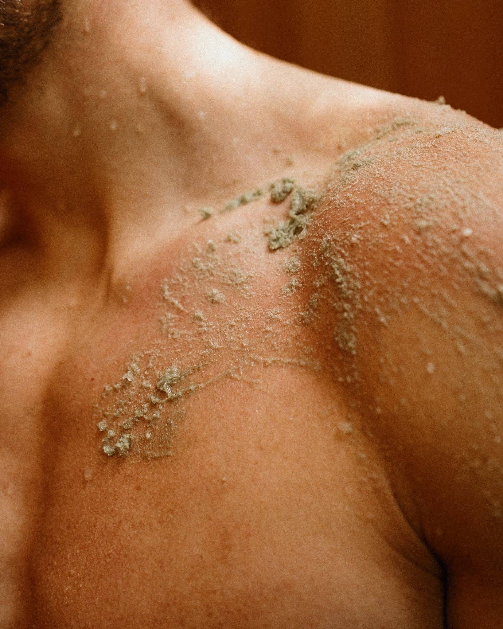 Ingredients: Sodium Chloride (fine sea salt), caprylic trigylceride (coconut oil), butyrospermum parkii (shea butter), illite (French Green Clay), ground pumice stone, citrus sinensus (blood orange oil) mentha piperita (peppermint)oil, euclayptus radiata oil, menthol