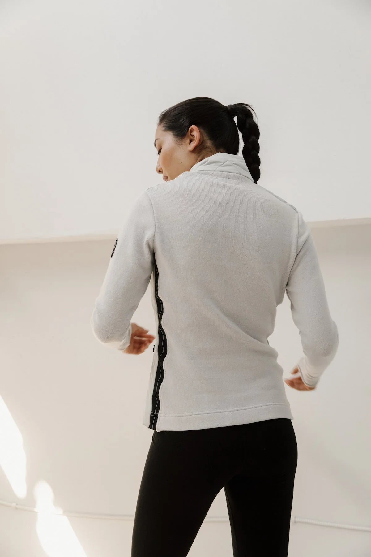 The Women's Palu Bora Performance Cashmere Jacket in Light Grey combines European craftsmanship with advanced textile innovation. Featuring NanoCashmere sleeves and back - molecularly engineered to resist water - paired with a Japanese front panel and CloudTherm raw cashmere insulation, this piece delivers exceptional warmth without bulk. Meticulously finished in Italy, it balances refined tailoring with everyday comfort, making it an investment in both performance and sophistication.
