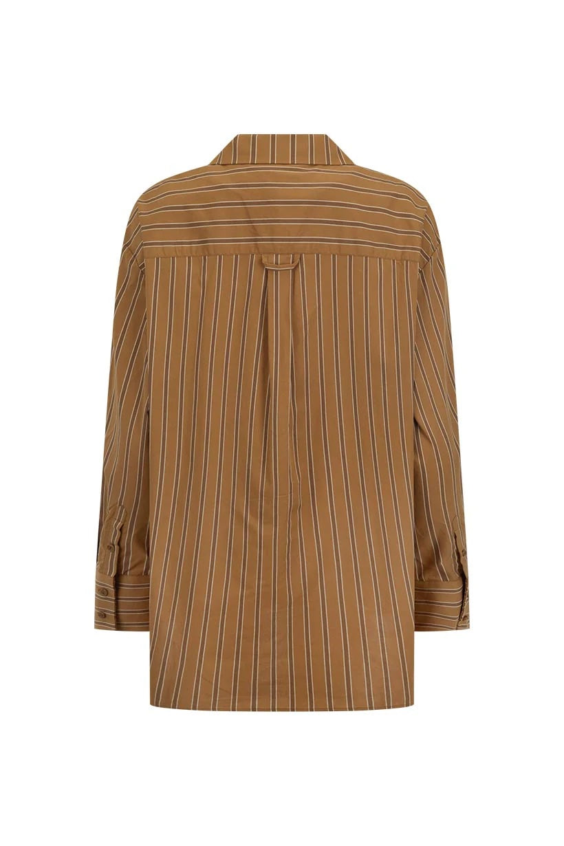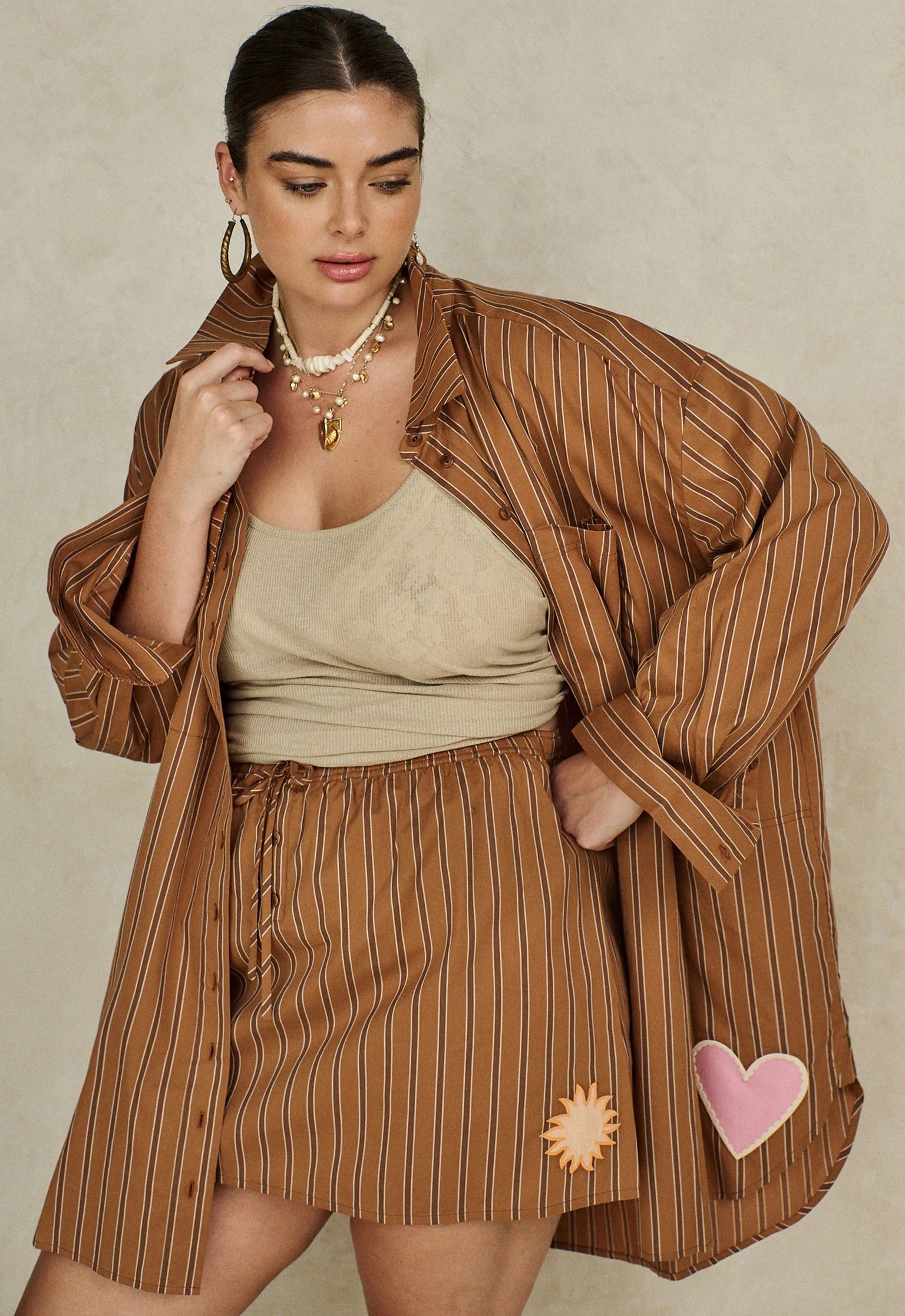 The Spell Off Duty Shirt in Caramel Cafe is made from 100% organic cotton with a relaxed, oversized fit and dropped shoulders. Stripe detailing and custom applique accents at the pocket and hem add subtle character. Long sleeves, front buttons, and unlined construction keep it lightweight and breathable - perfect for layering or wearing solo. A versatile staple that delivers comfort and understated style.