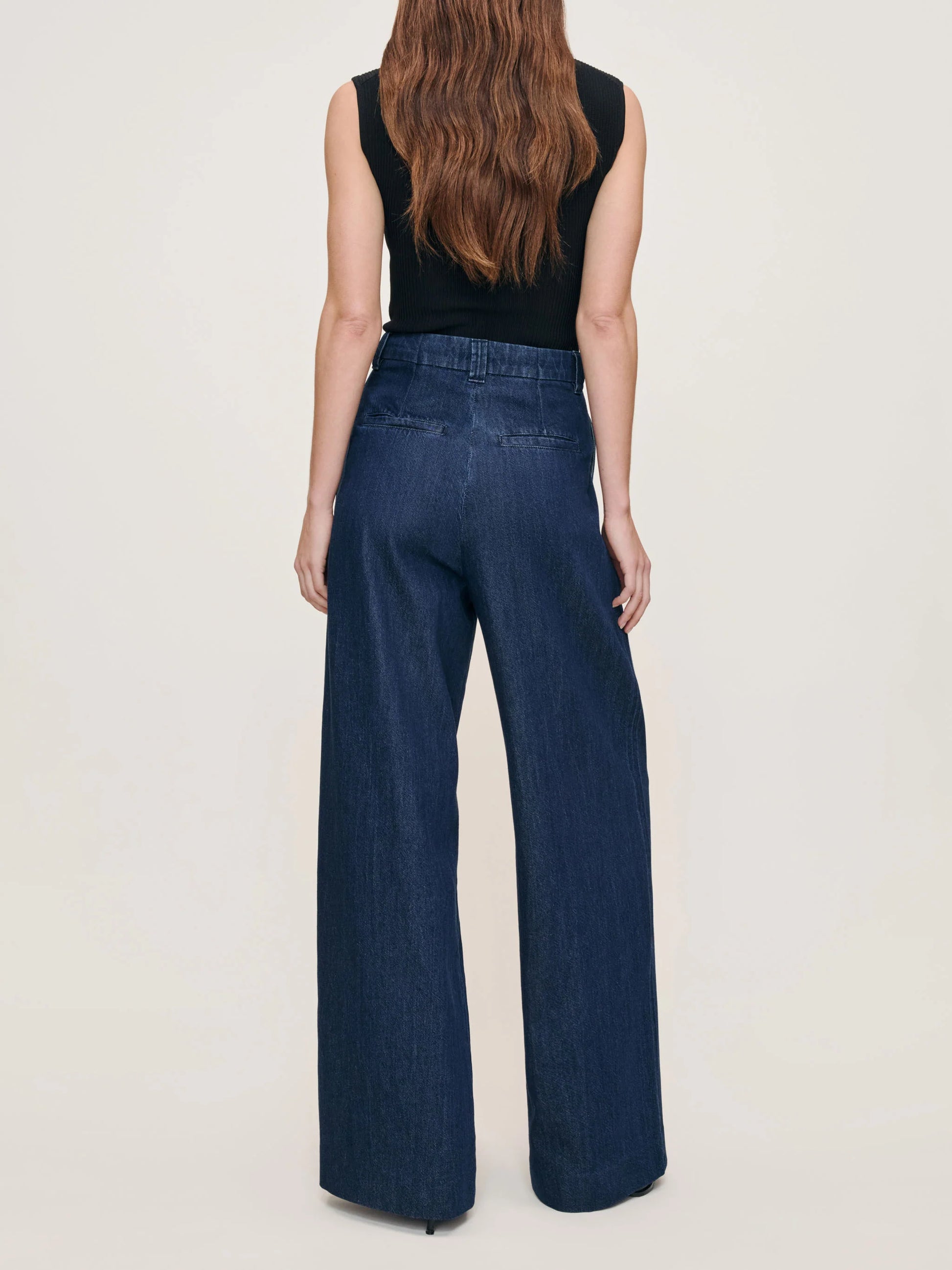 The DL1961 Hepburn denim features a high-rise design with pleating at the waist, promoting a relaxed fit through the hip and leg. Crafted from bright indigo River Valley denim, this style is complemented by brown horn buttons and tonal stitching, resulting in a polished, versatile look for various occasions.