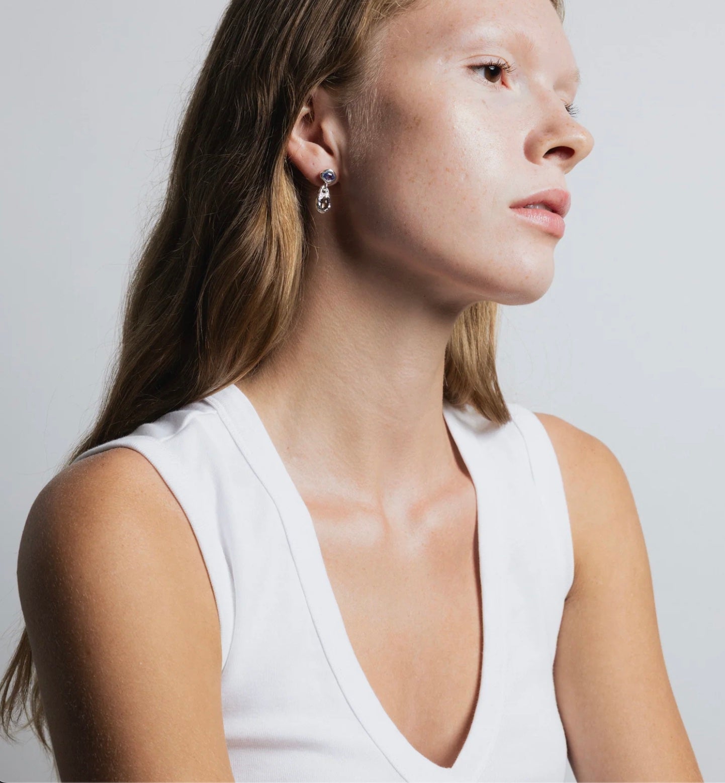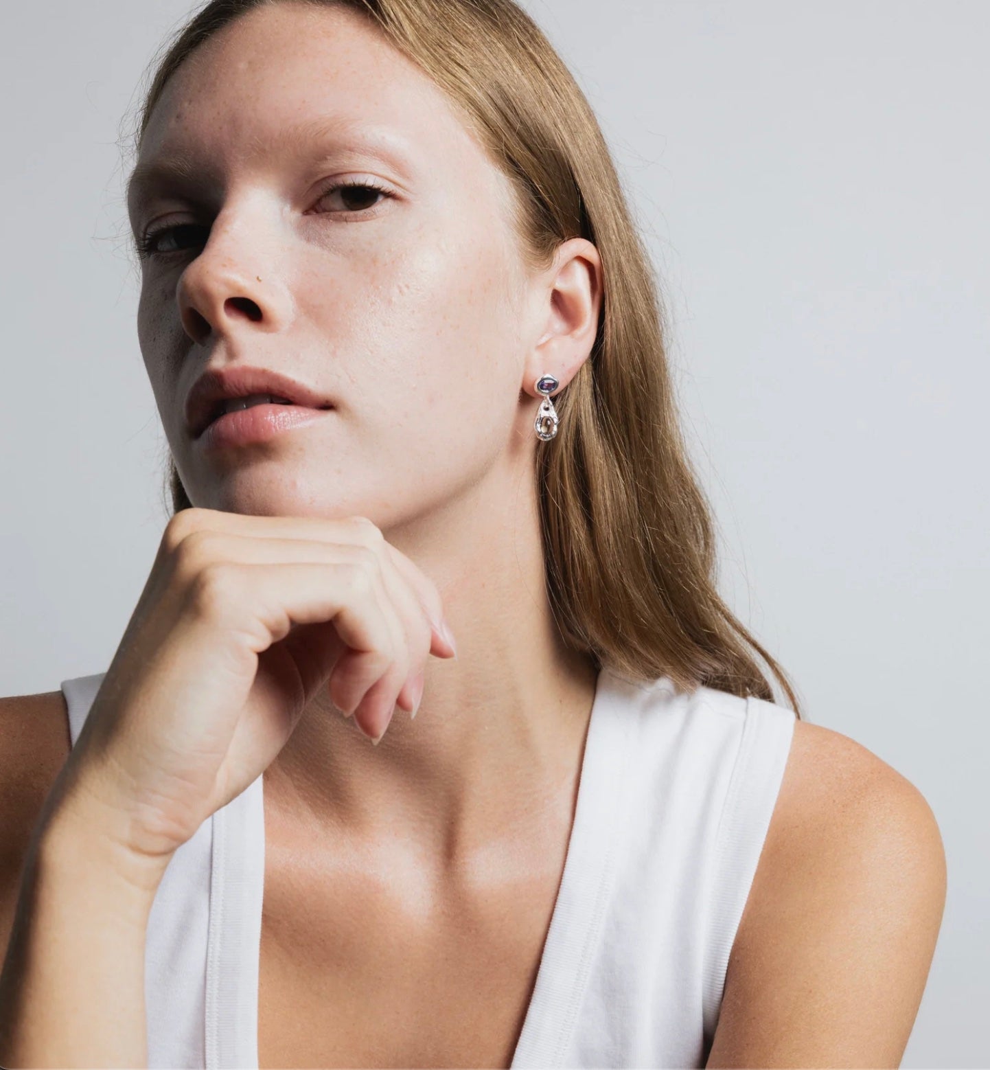 Featuring genuine Iolite and Smokey Quartz set in recycled 925 Sterling silver, these textured dangle studs exemplify thoughtful design and material integrity. Hypoallergenic posts ensure wearability for all skin types, while each pair is meticulously handcrafted by Wolf Circus artisans in Vancouver - a hallmark of quality fine jewelry.