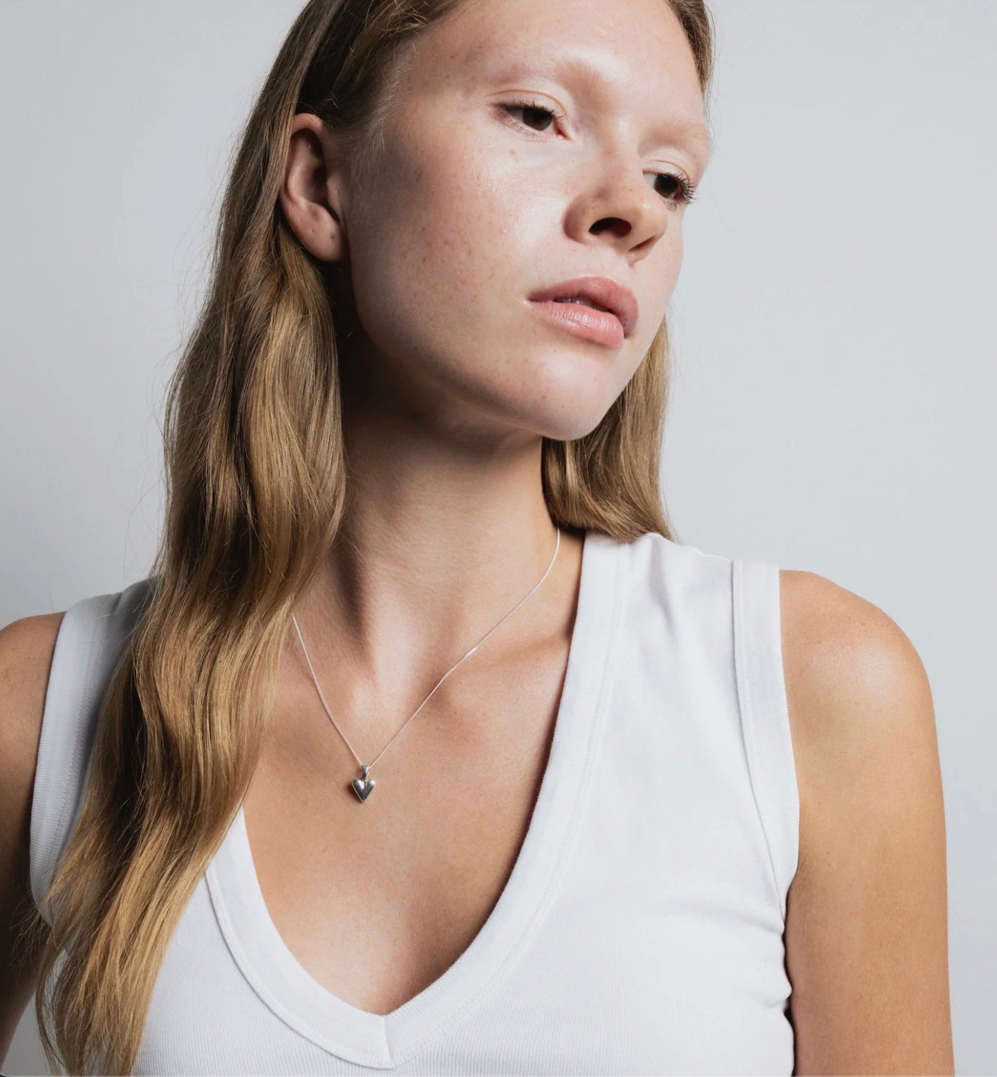 Delicate and timeless, this sterling silver heart charm necklace captures understated elegance. Crafted from recycled 925 sterling silver, the petite heart pendant hangs gracefully from an 18-inch curb chain, also in authentic 925 sterling silver. Perfect for layering or wearing solo, this piece combines sustainable craftsmanship with refined simplicity - a versatile addition to any jewelry collection.